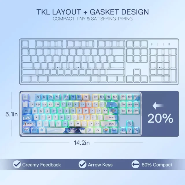 The innovative gasket-mounted design enhances flexibility and noise reduction, creating a softer, cleaner, and more enjoyable typing feel. Five layers of foam and dampening materials reduce hollow sounds, making every keystroke crisp yet quiet. The compact 80% layout ensures a clean desk setup without sacrificing functionality.