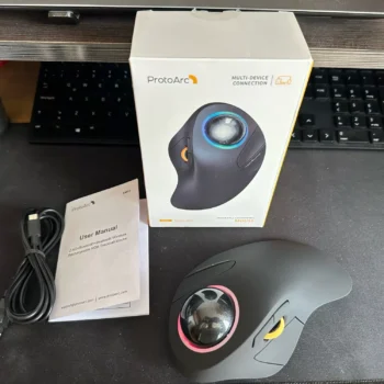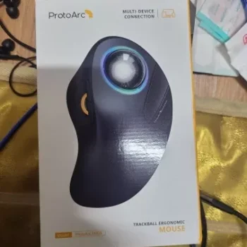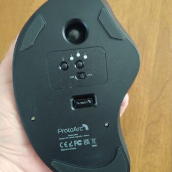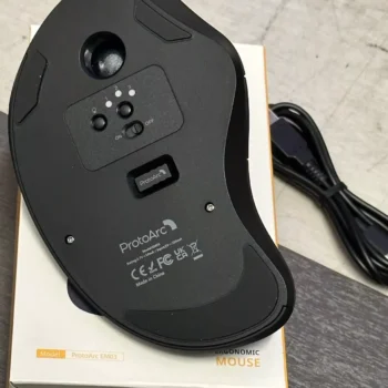 The ProtoArc Wireless Bluetooth Trackball Mouse, EM03 Ergonomic RGB Rollerball Mouse, has an excellent feel. The hand position is more comfortable, and the trackball feature improves operation as I don't have to move the mouse around. The ability to set up connections with three devices is a nice feature.