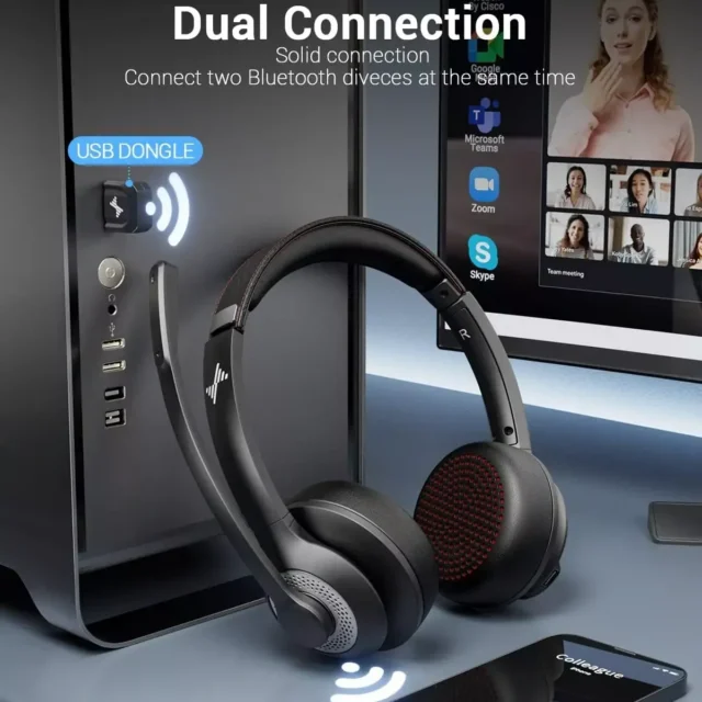Equipped with Bluetooth V5.2, this headset delivers fast pairing, stable connectivity, and exceptional audio clarity. Enjoy immersive sound with enhanced bass and crystal-clear details while watching movies, gaming, or listening to your favorite playlists. The included USB dongle ensures a reliable connection with your computer, making it perfect for professional use and virtual meetings.
