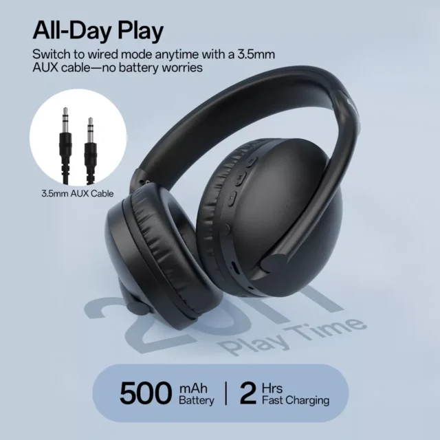 Feel the difference with 40mm dynamic drivers that deliver crystal-clear sound, booming bass, and detailed highs. Whether you’re commuting, working, or unwinding at home, these headphones give you a rich stereo HiFi experience without distractions. With a 500mAh battery offering up to 20 hours of playtime, plus an optional wired mode, you’re always covered—no matter how long your playlist is.
