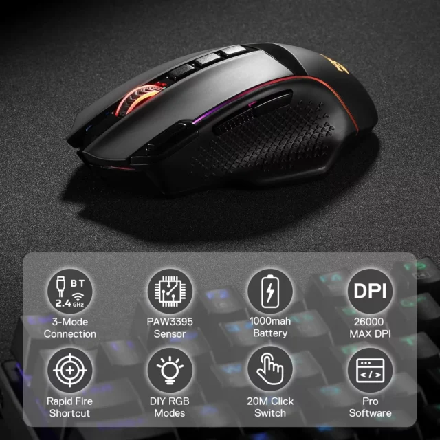This mouse comes equipped with cutting-edge technology to match your every move. With adjustable DPI settings that reach up to an incredible 26,000, you’ll enjoy pinpoint accuracy for both high-speed flicks and fine-tuned targeting. The PAW3395 Optical Pixart sensor ensures flawless tracking, while the 1000Hz polling rate keeps your movements consistently smooth. Built with three connection options – wired, Bluetooth, and 2.4GHz wireless – you’ll always have the flexibility to connect your way.