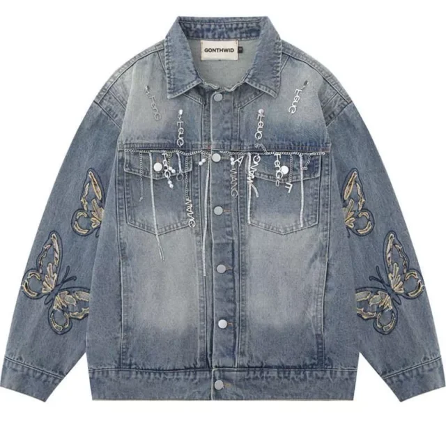 The standout feature of this jacket is the striking butterfly embroidery that adorns the back, giving it a unique and edgy vibe. The attached chain detail adds a touch of punk gothic flair, making it more than just a denim jacket – it’s a fashion statement. Unlike other jackets, this piece invites both men and women to enjoy its hip-hop-inspired look, making it a unisex gem in any fashion enthusiast’s collection.