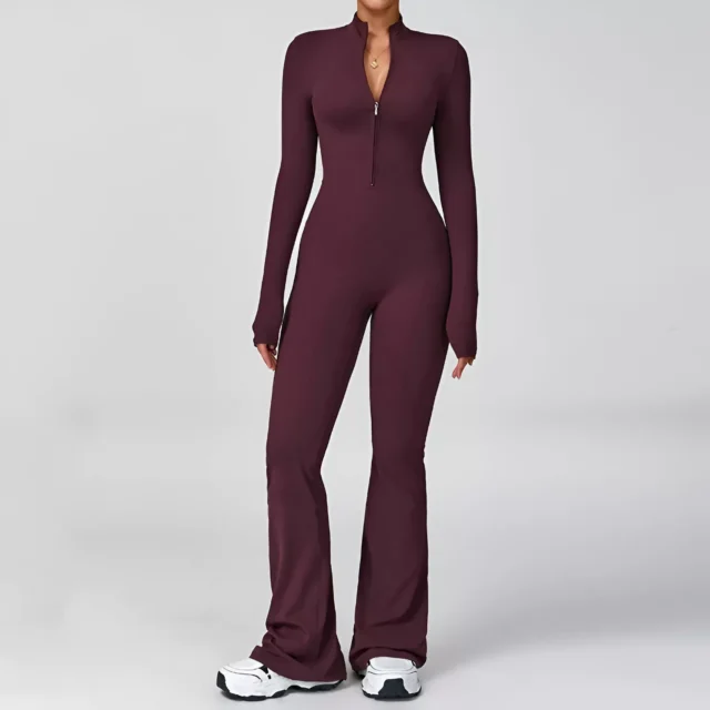 Crafted with a blend of nylon and spandex, this jumpsuit offers a stretchy, breathable fit that moves with your body. The seamless construction ensures a smooth silhouette with no irritation, making it ideal for high-intensity workouts or long yoga sessions. The full-length sleeves provide extra coverage and support, while the flared design adds a touch of flair to your workout wardrobe.