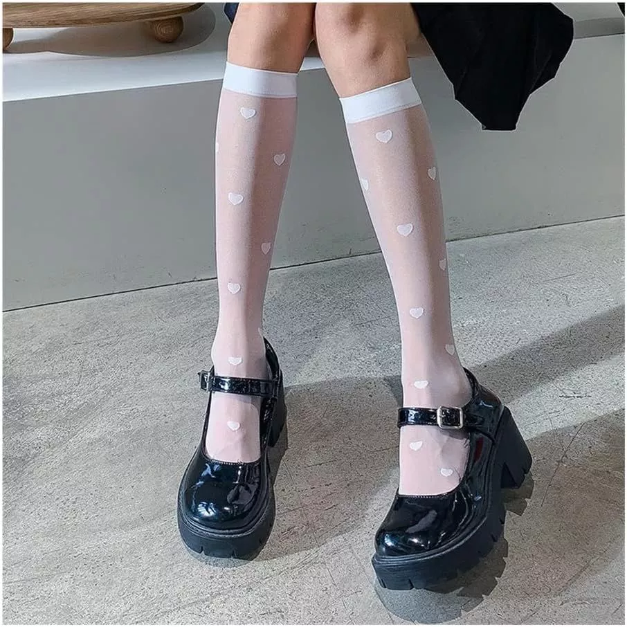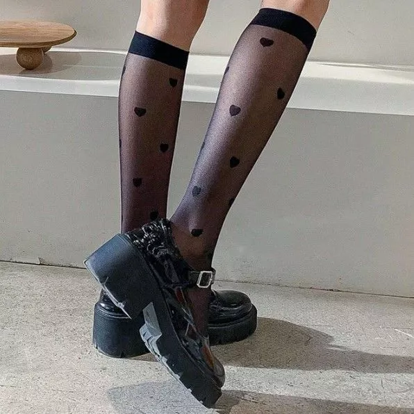 Elevate your style game with our Sheer Love Knee Socks, a mesmerizing blend of sophistication and allure. Crafted from luxurious nylon, these stockings boast a delicate see-through design adorned with charming love heart patterns, adding a touch of romance to any outfit.
