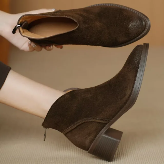 Women’s Natural Suede Leather Round Toe Back Zip Autumn Ankle Boots – 5cm Heel