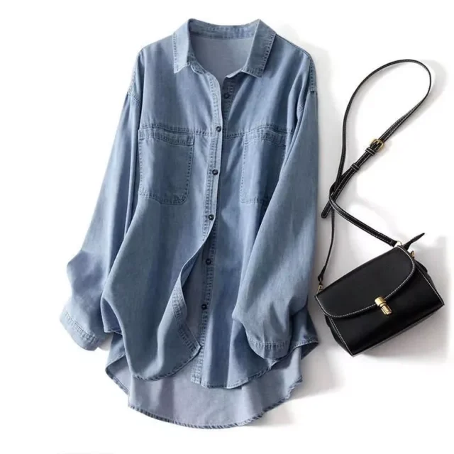 Women’s Oversized Denim Polo Shirt – Classic Loose Fit with Pockets