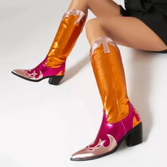 Turn heads this season with these stunning women’s western cowboy knee-high boots, designed to combine elegance, comfort, and a touch of daring style. Featuring a gorgeous patchwork of gold and pink tones, these boots are the perfect blend of classic western flair and modern chic. Whether you’re stepping out for a night on the town, dressing up your casual outfits, or adding edge to your winter wardrobe, these boots will instantly elevate your look.